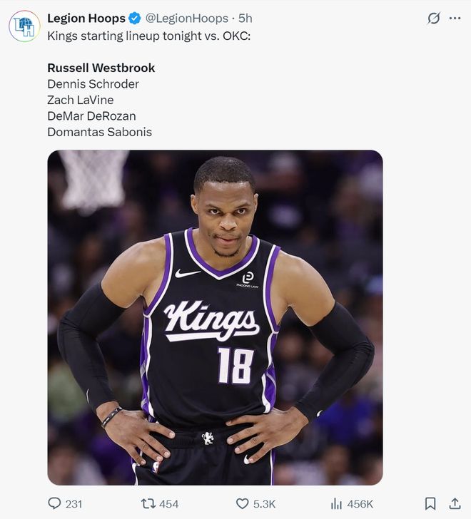 国王对威少重返俄城的第一场比赛也十分重视,他们甚至摆出了一套三后卫的先发阵容,威少是先发的一号位,搭档施罗德、拉文,让拉文移动到了小前锋的位置。